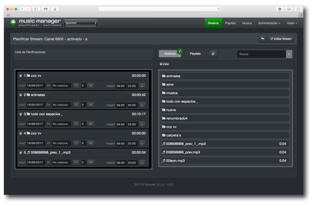 Deje programado lo que va a sonar en cada punto de reproducción la próxima semana. Aplique sonido a diferentes franjas horarias gestionando cada Streamer. Construya su propia biblioteca de sonidos en formatos MP3 y MP4 e incorporales al sistema desde cualquier lugar.